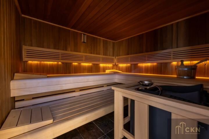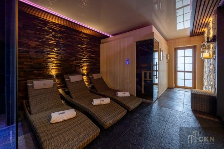 Wyposażenie: sprzedawany w pełni umeblowany, z wyposażeniem RTV i AGD Dodatki: sauna, balia fińska, sala zabaw z kominkiem, garaż pod tarasem, parking na 46 aut
